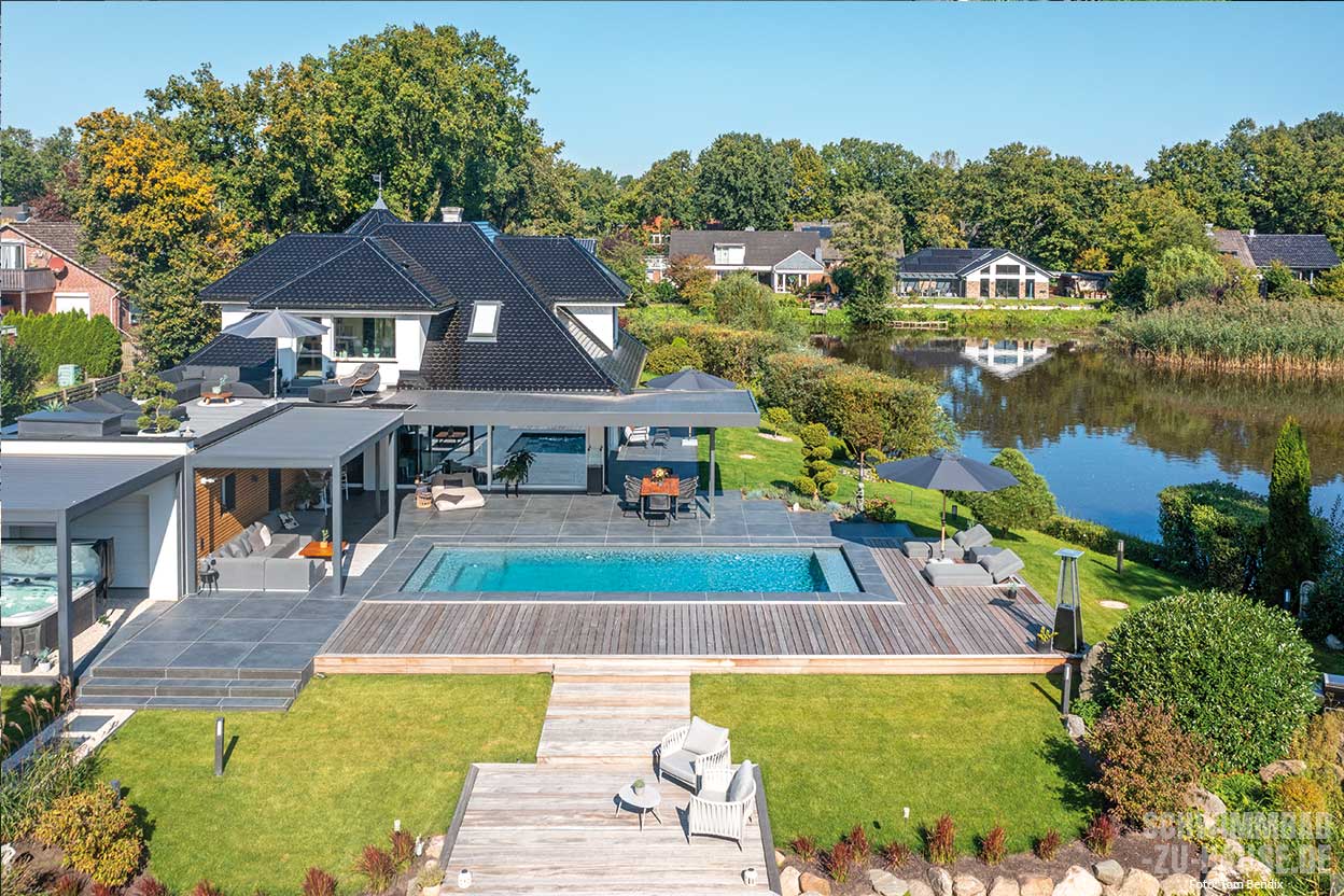 Schon der Blick aufs Wasser tut unserer Seele gut. Wer das Glück hat, an einem Gewässer zu wohnen, genießt die Ruhe der Natur, kann sich wunderbar erholen und profitiert von mehr Wohlbefinden und Lebensqualität. Bei diesem Anwesen im Kreis Segeberg macht ein eigener Pool mit Seeblick das