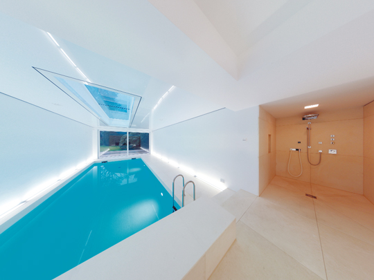 Das Hallenbad wurde überwiegend in Weiß ausgeführt – die Lackspanndecke, die Beckenauskleidung und die Spezialwandfarbe, die auf die Wärmedämmung („Iso-Plus-System“) aufgetragen wurde. Als Bodenbelag wählte man hellen Naturstein. Gleich angrenzend in etwas erhöhter Lage befindet sich der Dusch- und Relaxbereich im ursprünglichen Wohnhaus. Die offene Duschanlage ist in einer Nische platziert und mit dem Kopfbrausesystem „Raindance Rainfall“ von Hansgrohe, einem Kneippschlauch und einer Stabhandbrause ausgestattet. Lichttechnisch wurde das Schwimmbad mit zwei Unterwasserscheinwerfern versehen. Für die beiden Lichtleisten entlang der Hallenlängswände haben die Schwimmbad-Spezialisten von SSF mehrere Iguzzini-Leuchten aneinandergereiht – sie strahlen mit rein weißem Licht.