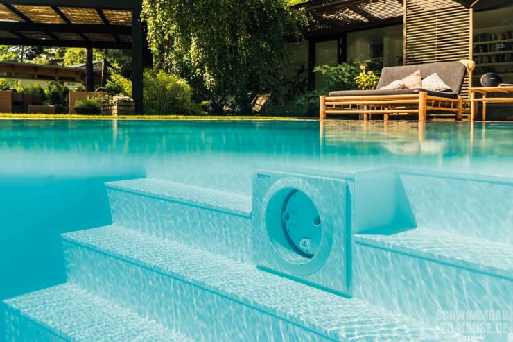 Apropos in vollen Zügen genießen: Da sowohl der Bauherr als auch seine Frau großen Gefallen am Ausdauerschwimmen haben, war eine kraftvolle Gegen- stromanlage absolutes Must-have. Mit der „Badu Jet Super Sport“ von Speck Pumpen, die oberhalb der breiten Einstiegstreppe verbaut ist, kommt die Familie nun auch in puncto Sport voll auf ihre Kosten. Im Interview mit haus und wellness* schwärmt der Bauherr abschließend: „Wir sind mit dem Ergebnis sehr zufrieden. Jedes Mal, wenn ich Gäste habe, sind sie von dem Becken ganz begeistert und ich muss viele Fragen zum Typ des Überlaufs beantworten.“