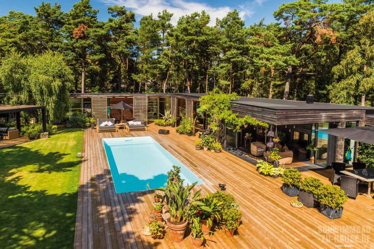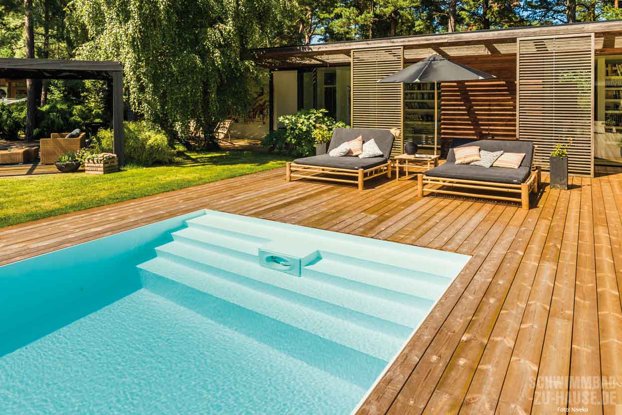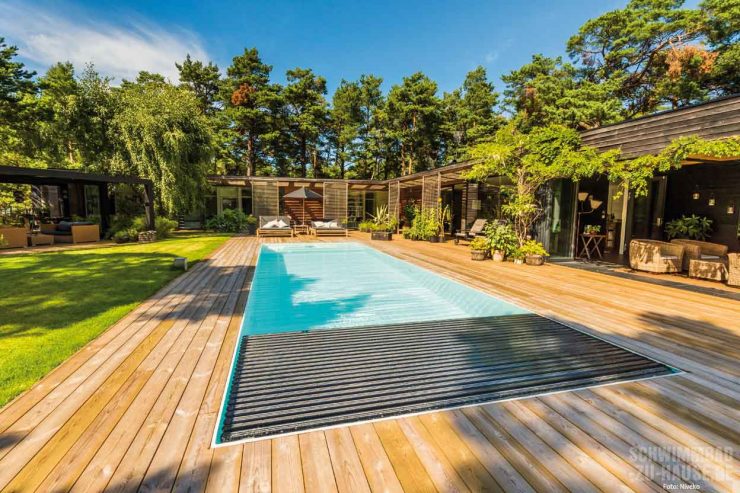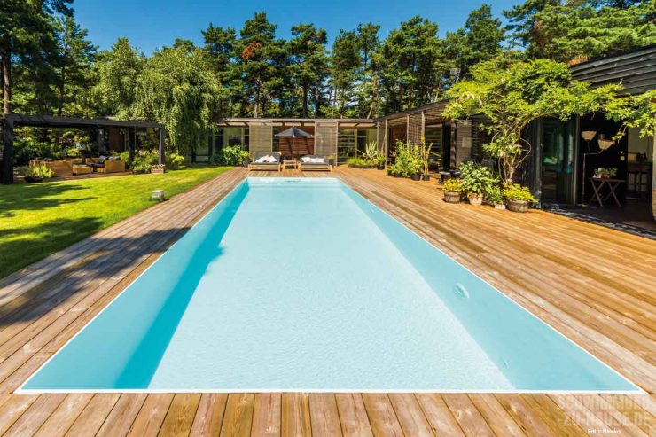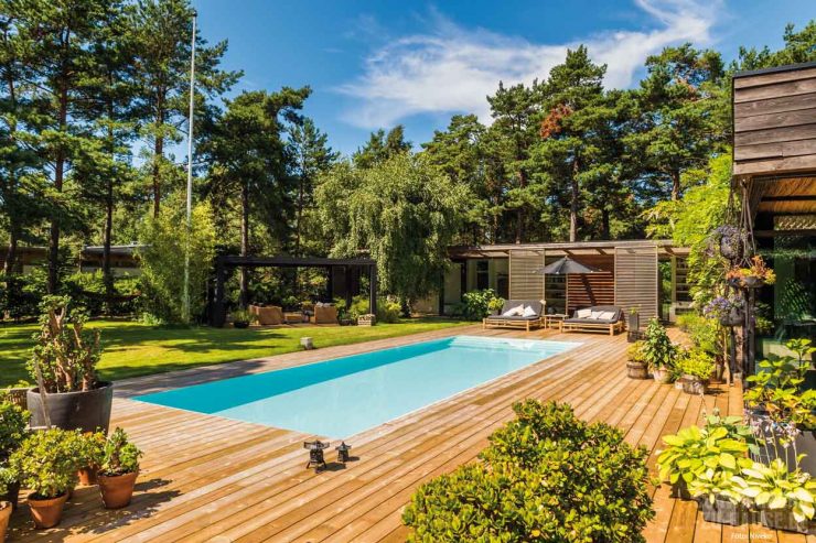 Um einen optischen Ausgleich zu den natürlich wachsenden Pflanzen zu finden und gleichzeitig eine architektonische Verbindung zu dem Wohnhaus herzustellen, machte sich das mit Bau und Planung des Projekts beauftragte Team von Söderro Gård auf die Suche nach einem passenden Überlaufecken. Beim Hersteller Niveko wurde man fündig: Das Einstückbecken „Evolution“ mit seiner geradlinigen Form, Überlauf und der Treppe, die über die ganze Beckenbreite verläuft, entsprach exakt den Vorstellungen der Familie. Pluspunkt: Der Einbau des Beckens ging schnell innerhalb weniger Tage vonstatten, sodass die Bauherren und ihre Kinder schon nach der Planungsphase ins kühle Nass springen konnten. Dank seiner klaren, rechteckigen Form wirkt der Pool mit den Maßen 10,35 x 3,60 Meter elegant und designorientiert. Bei der Beckenumrandung entschied sich das Schwimmbad-Team für eine Einfassung aus naturbelassenem dunklen Holz. Die stringent gerade verlaufenden Bretter greifen die Holzvertäfelung des Hauses auf und schaffen so eine harmonische Verbindung.