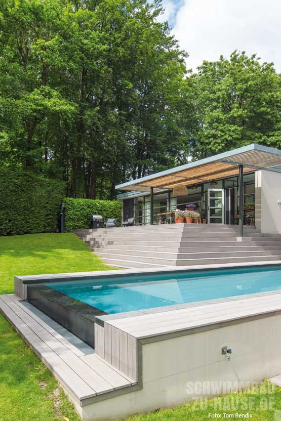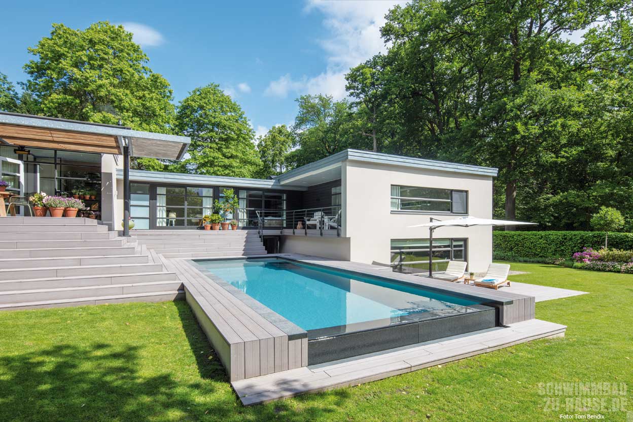Einen Umbau von Terrasse und Garten nahm der Bauherr zum Anlass, auch einen modern designten Pool nachzurüsten. Jetzt fügt sich das Schwimmbecken hervorragend in das neue Erscheinungsbild ein.