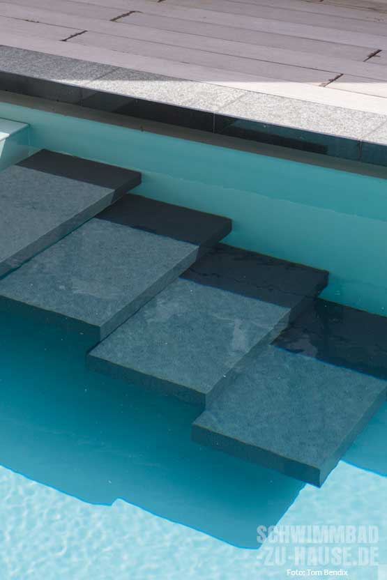 Beim Pool selbst handelt es sich um ein Polystone- Becken in der Größe 10 x 3,70 Meter und der Farbe Grau. Neben der Infinity-Rinne verfügt der Pool noch über ein Podest im Einstiegsbereich, das als Entspannungszone nach dem Schwimmen genutzt werden kann. Unter dem Podest verbirgt sich die Rollladenabdeckung, die auf Knopfdruck ausfährt und sich dann über die Wasserfläche legt. Ein interessantes Detail ist auch die Einstiegstreppe: Die vier Stufen aus Naturstein sind frei in der Beckenwand verankert, sodass sie im Wasser zu schweben scheinen. Außerdem wurden Einbauteile aus Edelstahl verwendet, die ebenfalls dem edlen Gesamteindruck des Beckens entsprechen. LED / RGB-Unterwasserscheinwerfer komplettieren die Ausstattung.