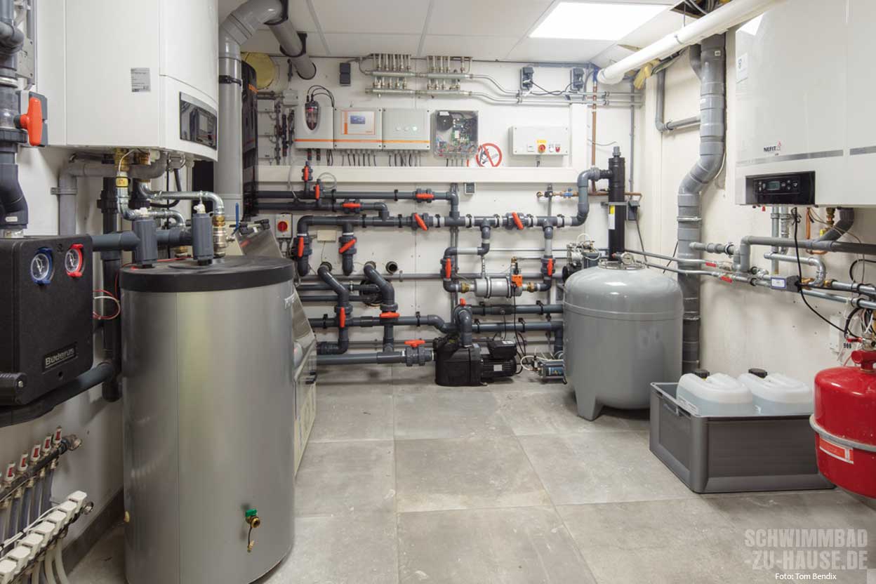 Hinter dem Pool führt eine Treppe hinab ins Untergeschoss des Hauses, das komplett unterkellert ist. Hier, in einem separaten Raum, ist die Schwimmbadtechnik sauber und revisionsfreundlich installiert. Zur Ausstattung gehören eine Filteranlage mit Mehrwegeventil und frequenzgesteuerter Pumpe, die Elektrolyseanlage „Soprazon Premium 19“, die Mess- und Regelanlage „Sopra Test Premium 17“ auf Basis von Chlor- und pH-Wert-Steuerung und mit Touch-Display zur bequemen Kontrolle der Wasserwerte sowie eine zusätzliche UV-Desinfektion. So erfreut sich der Bauherr nicht nur an einem modern designten Pool, sondern auch an einer hervorragenden Wasserqualität.