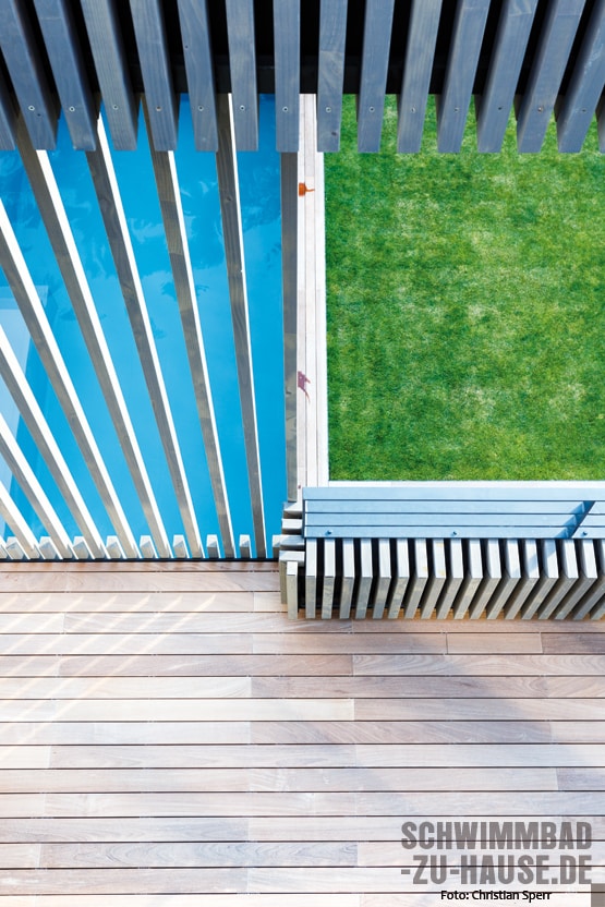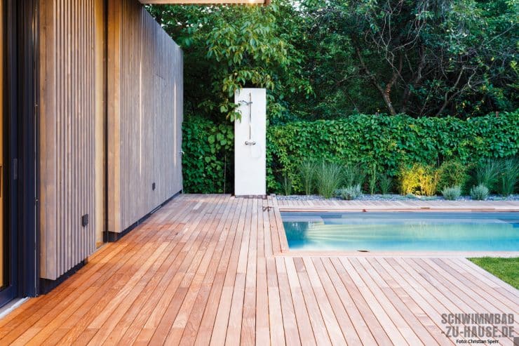 Das Herzstück des Gartens ist der neue Familienpool, der mit seinen kompakten Maßen von 7,0 x 3,0 x 1,5 Meter immer für eine Abkühlung bereitsteht. Das Skimmer-Beton-Becken wurde mit einer Folie in der Farbe Anthrazit verkleidet und garantiert so immer eine wunderschöne Wasserfarbe. Passend zum Haus besteht die Poolumrandung aus Holz. Das natürliche Material schafft damit eine direkte Verbindung zur Terrasse und dem großzügig verglasten Wohnraum. Für den leichten Einstieg in das Betonbecken sorgt eine elegante seitliche Treppe, die auf Höhe der ersten Stufe über eine Flachwasserzone verfügt, die zu entspanntem Liegen im Wasser einlädt.
