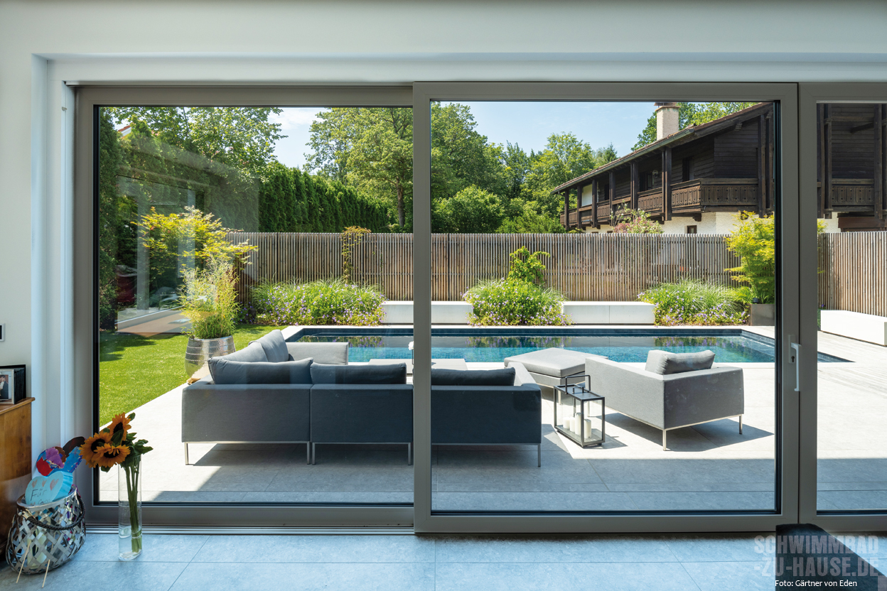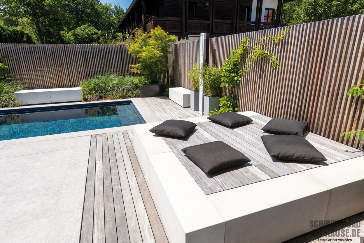 Der Garten als Pool-, Ess- und Spielzimmer, thematisch geschickt gegliedert und mit einem hohen ästhetischen Anspruch: Dieses Objekt südlich von München zeigt, wie sich unterschiedliche Nutzungswünsche trotz räumlicher Beschränkungen optimal vereinen lassen. Dank sorgfältiger Planung und Gestaltung wirkt die Anlage aber keineswegs überladen, sondern lässt den kleinen Garten groß rauskommen.