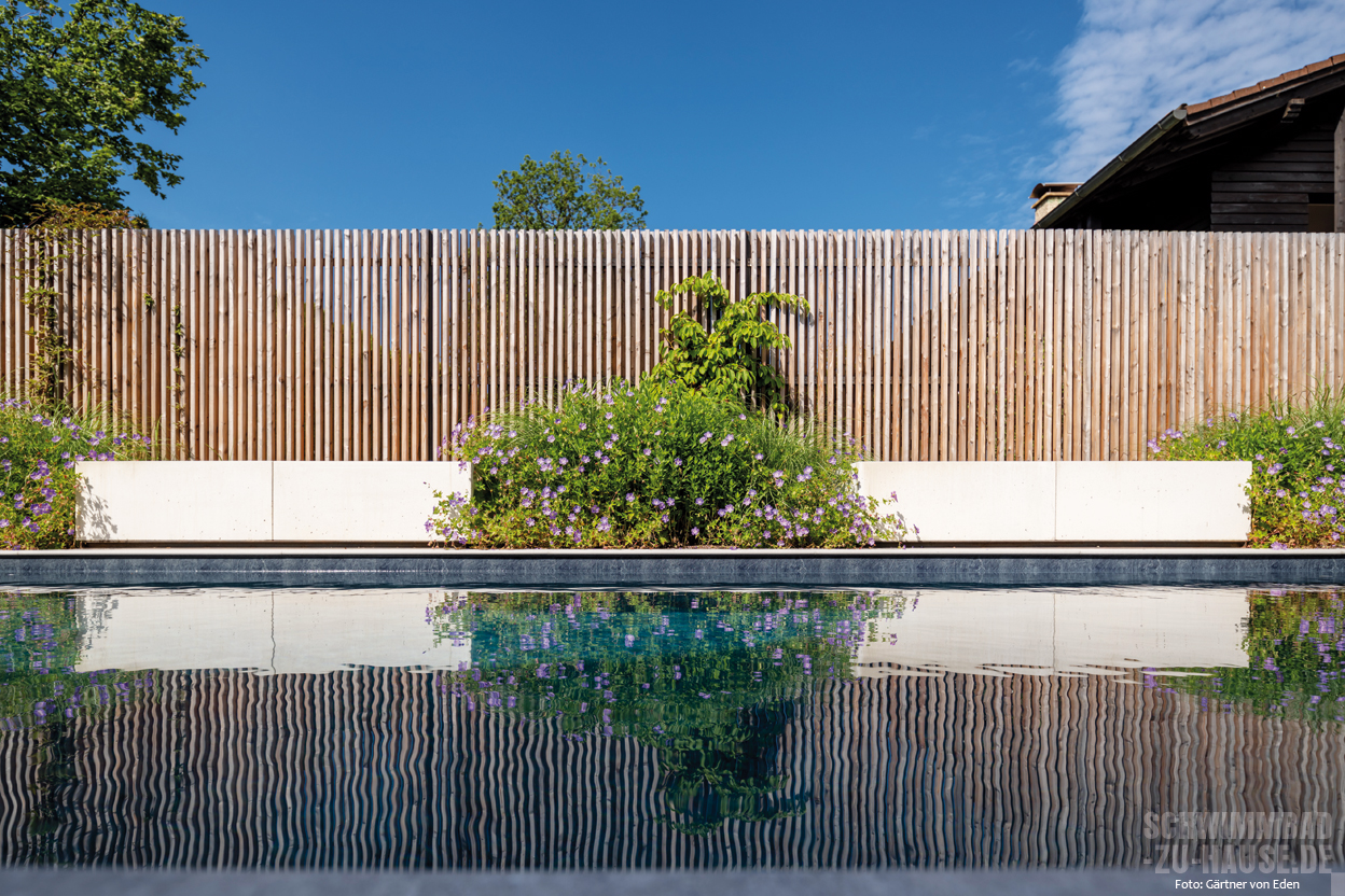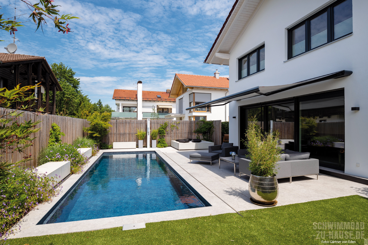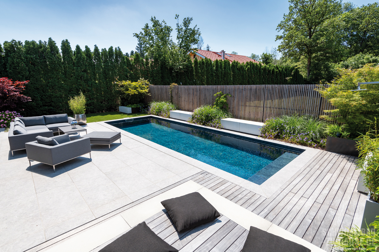 Mit diesen Herausforderungen sahen sich die Schwimmbadprofis von A1 aus München und die für die Gartengestaltung verantwortliche Firma Majuntke, ein Mitgliedsunternehmen der „Gärtner von Eden“, konfrontiert. Unter dieser Bezeichnung haben sich rund 50 Gartengestalter aus Deutschland, Österreich und der Schweiz zusammengeschlossen, die sich auf die kreative Planung und Umsetzung von Privatgärten spezialisiert haben. Die Gestaltung wurde in mehreren Varianten mit den Hausbesitzern diskutiert und per CAD-Planung visualisiert, bis schließlich ein harmonisches Gesamtkonzept entstanden ist.