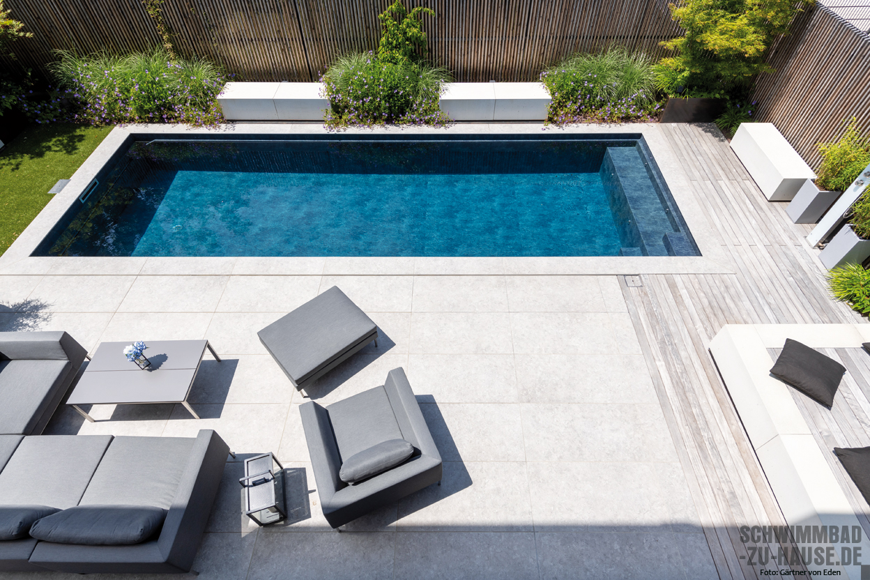 Hauptattraktion ist natürlich der 9,20 x 3,00 Meter große Swimmingpool, der mit schillernden Blautönen zum Sprung ins frische Nass einlädt. Dafür wurde das Betonbecken mit der Alkorplan-Folie Touch Elegance ausgekleidet. Ein kleines Wasserspiel und Unterwasserscheinwerfer sind zusätzliche Highlights. Sitzblöcke aus glattem Sichtbeton, ein großer Lounge- und Terrassenbereich sowie ein einladendes Sonnendeck unterstreichen den Wohlfühlcharakter der?Anlage.
