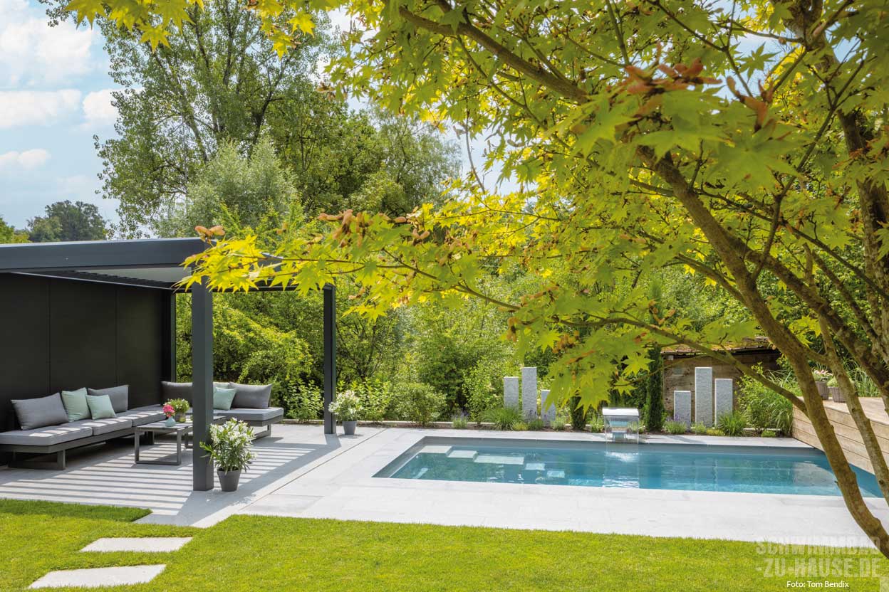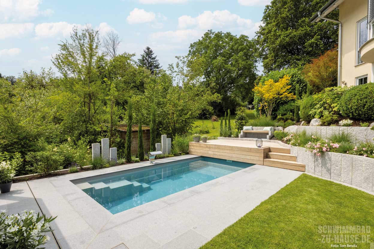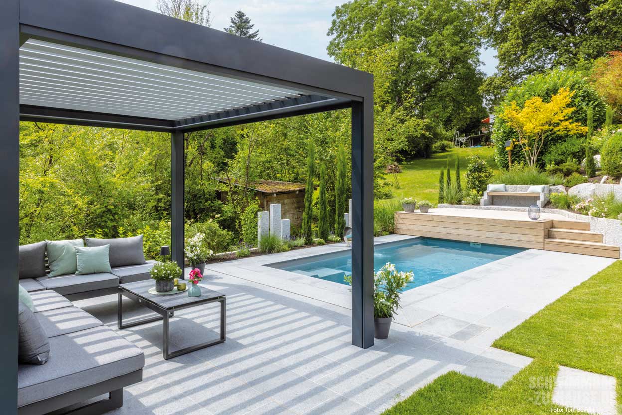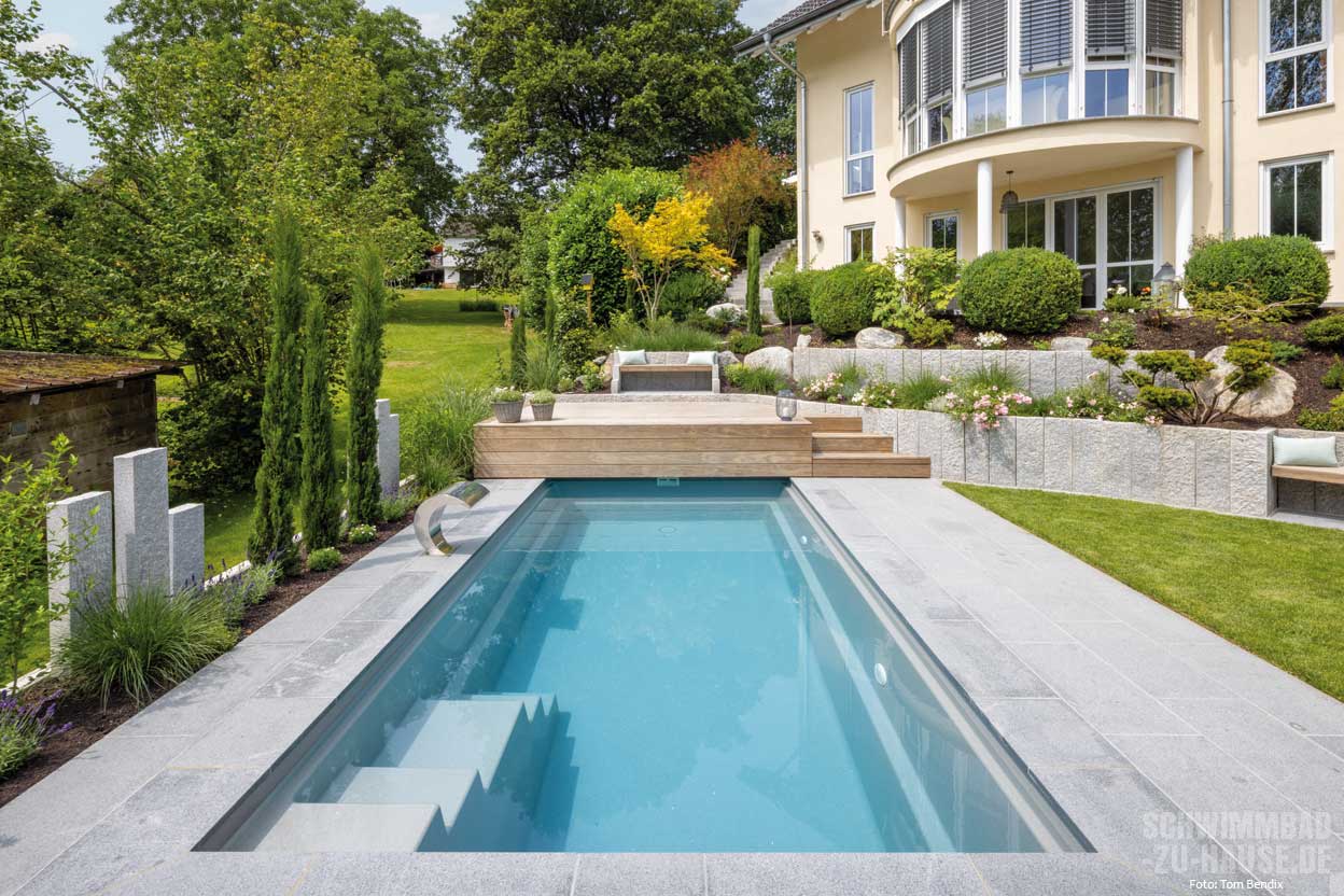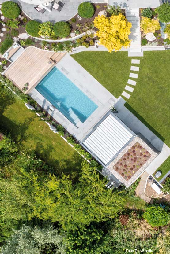 Erneuerung, und so beschloss Familie Sütterlin, die anstehende Umgestaltung auch gleich mit dem Bau eines Pools zu verbinden. Das Ergebnis ist eine wunderschöne Wohlfühloase im Grünen mit dem Element Wasser als integralem Bestandteil der Außenanlage.