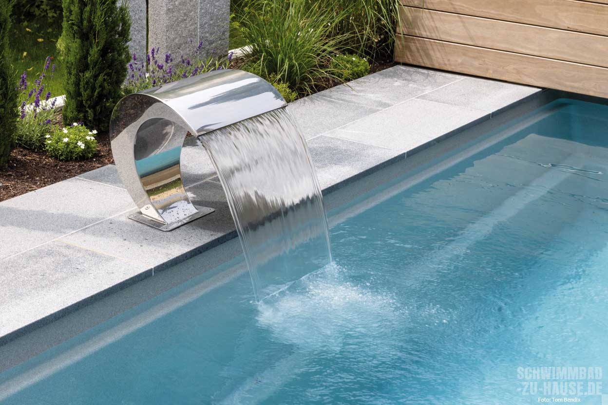 Die Beckenfarbe Nova Grey verleiht dem Wasser einen holografischen Effekt und harmoniert sehr gut mit den Natursteinplatten aus anthrazitfarbenem Granit.