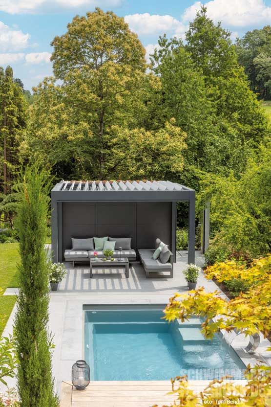 Die Beckenfarbe Nova Grey verleiht dem Wasser einen holografischen Effekt und harmoniert sehr gut mit den Natursteinplatten aus anthrazitfarbenem Granit, die sich bis zur Pergola mit Chillout-Lounge hinter dem Pooleinstieg hinziehen. Eine Astral-Schwalldusche bringt Bewegung und Leben ins Wasser, während die umgebende Bepflanzung mit Zypressen, Hortensien, Ölweide und Gräsern die Anlage in einen traumhaften Rückzugsort verwandelt – ideal zum Wohlfühlen und Genießen.