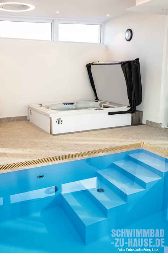 Zum Garten hin ist das Hallenbad mit einer längsseitigen Glasfront versehen, die am Beckenende in einen deckenhohen Spiegel übergeht. Dies schafft eine perfekte Illusion, die den Wellnessbereich deutlich größer wirken lässt. Mit der Planung hatten die Bauherren einen Architekten beauftragt. Die Umsetzung erfolgte durch den Topras-Partner Delfin Wellness, der von einem Verwandten der Familie empfohlen worden war.
