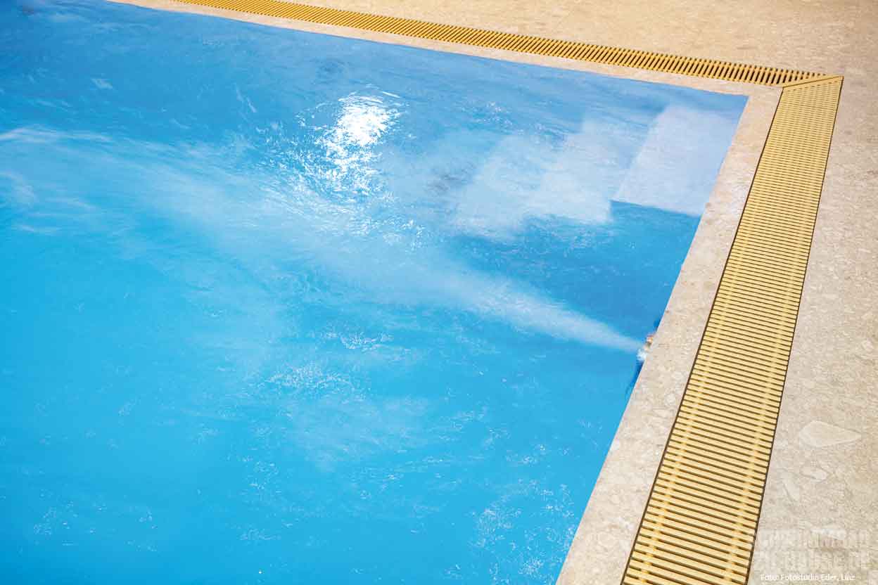 Das Becken mit den Maßen 7 x 3 x 1,4 Meter ist mit der besonders widerstandsfähigen Renolit-Folie „Alkorplan Xtreme“ verkleidet und hat eine Überlaufrinne, die innen mit Feinsteinzeug ausgelegt ist. Obwohl der Schwerpunkt auf Entspannung liegt, sorgt eine Gegenstromanlage dafür, dass der Rentner und seine Familie auch einmal längere Zeit am Stück schwimmen können. Eine Wandschwalldusche ermöglicht eine kraftvolle Nackenmassage. Martin Mittermayr legt bei seinen Projekten viel Wert auf Qualität und alle Einbauteile bestehen aus hochwertigem V4A-Edelstahl.