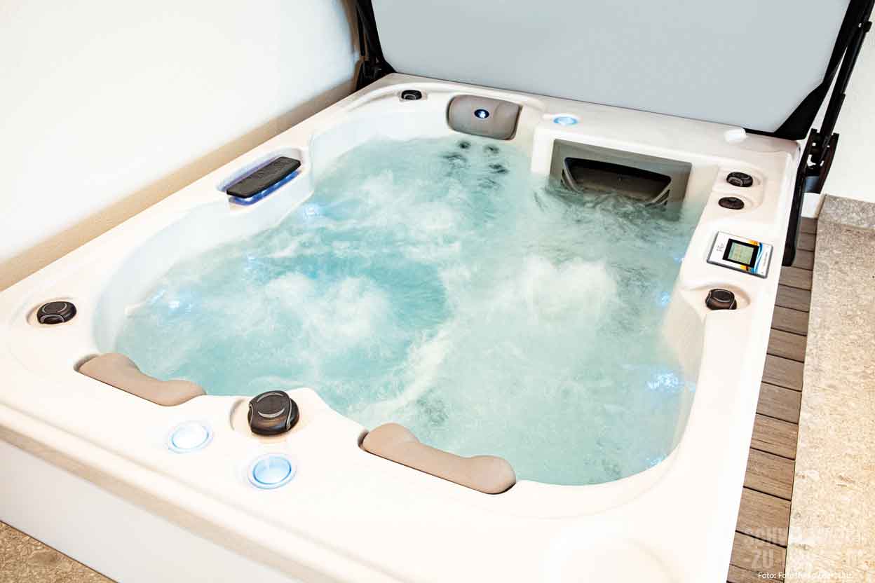 Ein weiteres Highlight des Wellnessbereichs ist der Whirlpool von Whirlcare. 36 Hydrotherapiedüsen, die auf zwei Massagesitze und eine -liege verteilt sind, lockern die Muskeln und sorgen für Wohlbefinden. Hier kann die Familie entspannen und den Alltag vergessen. Und es scheint ihnen so, als tickten die Uhren tatsächlich langsamer …