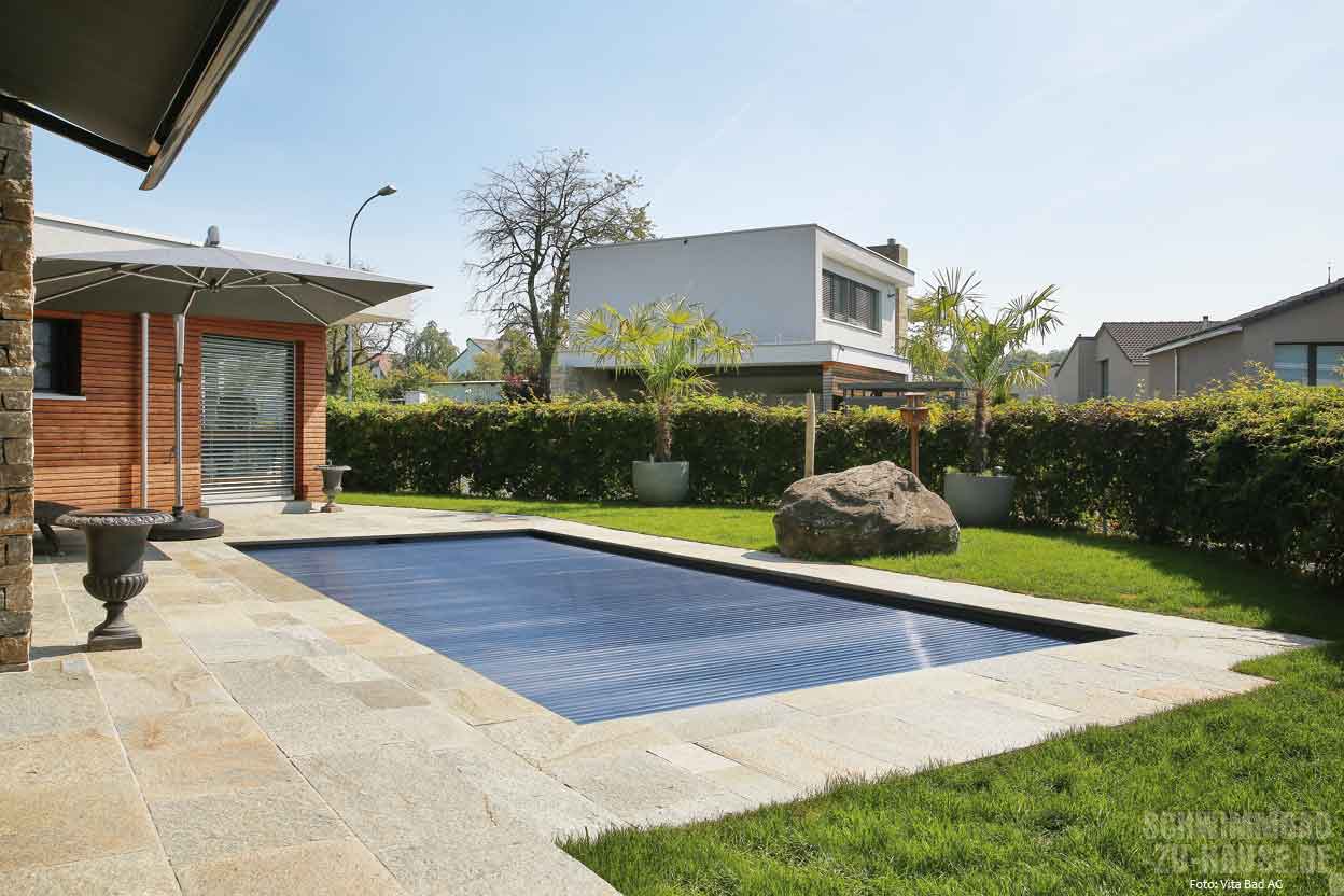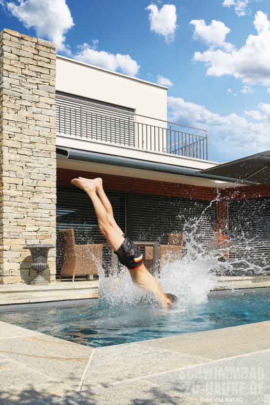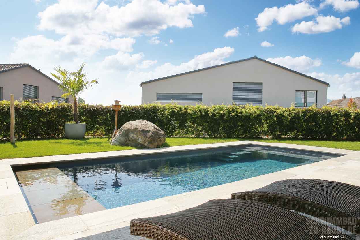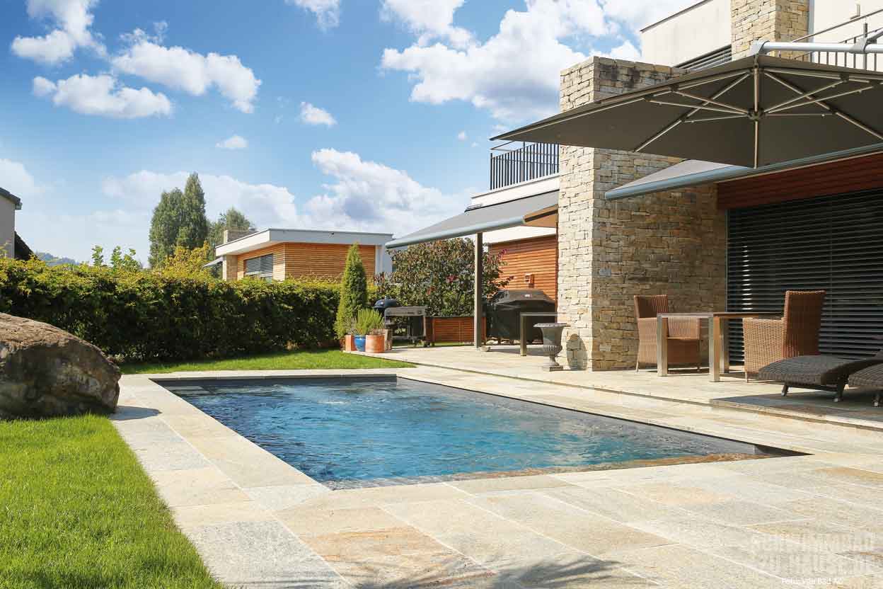 Dass die mit Natursteinen umrandete Poolanlage in Verbindung mit Haus und Garten wie aus einem Guss wirkt, ist der guten Zusammenarbeit von Schwimmbadbauer, Landschaftsarchitekt und Gartenbauer zu verdanken. Über Größe und Form des Schwimmbads hatte die Familie schon klare Vorstellungen. Ausschlaggebend für die Umsetzung war schließlich der Geschäftsbesuch bei der Firma Vita Bad, an deren Sitz in Ermensee im Kanton Luzern sich die größte Schwimmbadausstellung der Schweiz befindet.