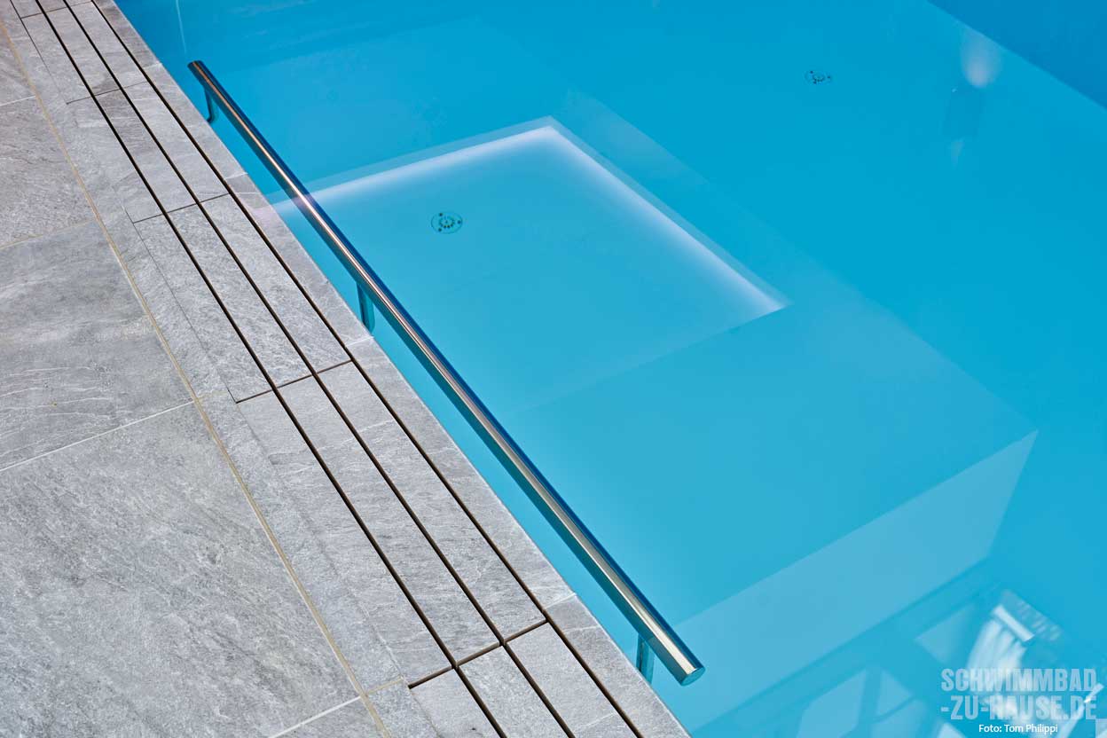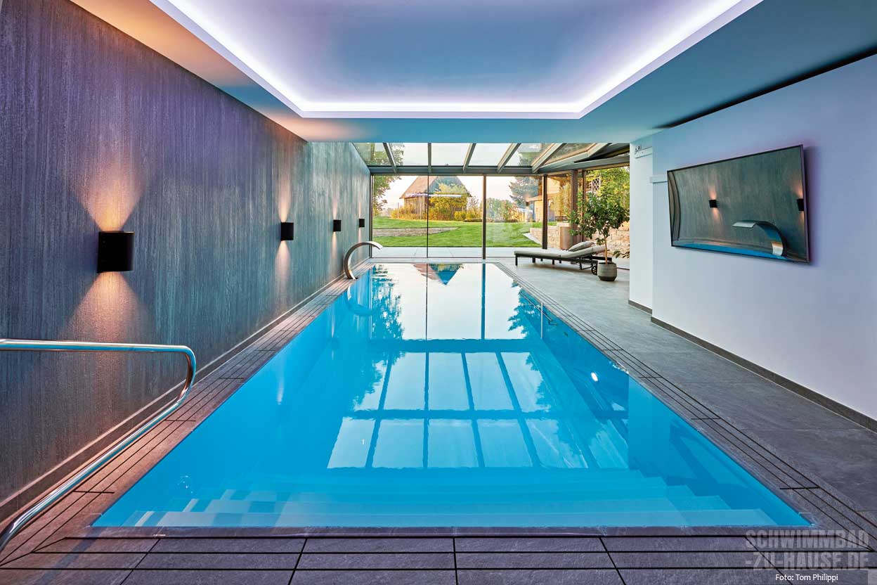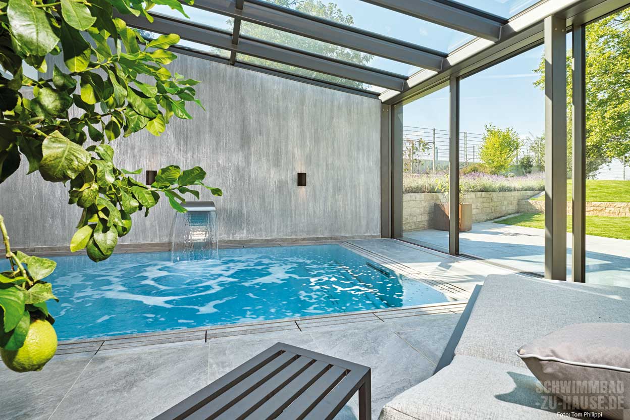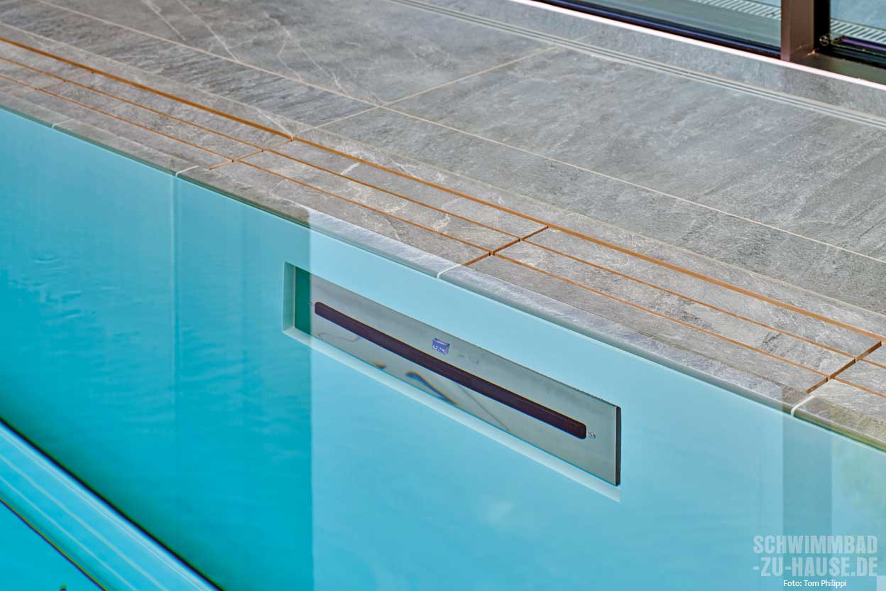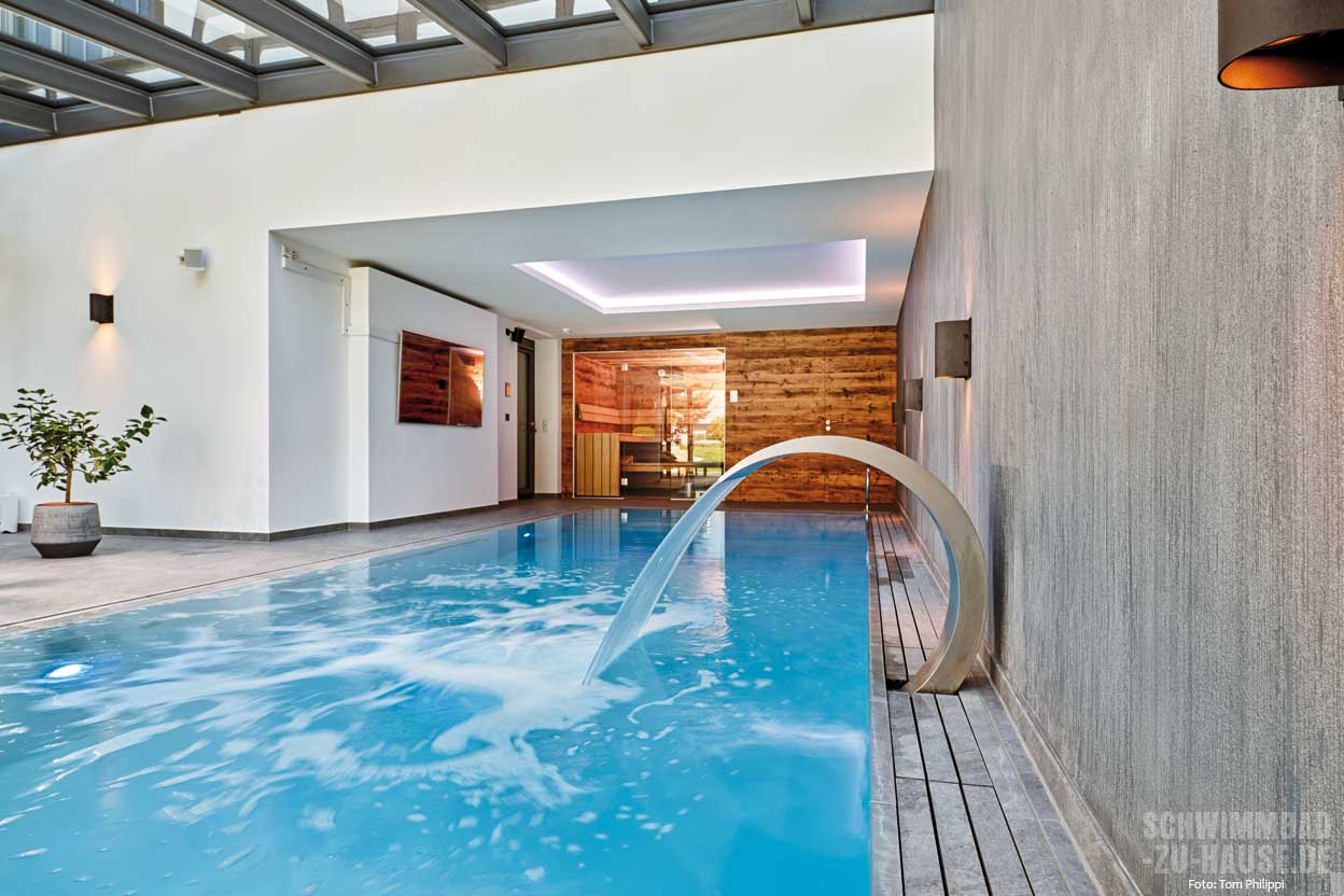 Mit Massagedüsen, Schwalldusche und einer starken Gegenstromanlage bietet der 8,60 x 3,60 Meter große Pool alle Optionen für Schwimmspaß und Wellness. Für gesundes und kristallklares Wasser sorgt die Topras-Filteranlage, die nicht nur den Energieverbrauch, sondern auch den Einsatz von Chemikalien reduziert. Dank Vollautomatik und Fernüberwachung ist der Aufwand für die Wasserpflege minimal.
