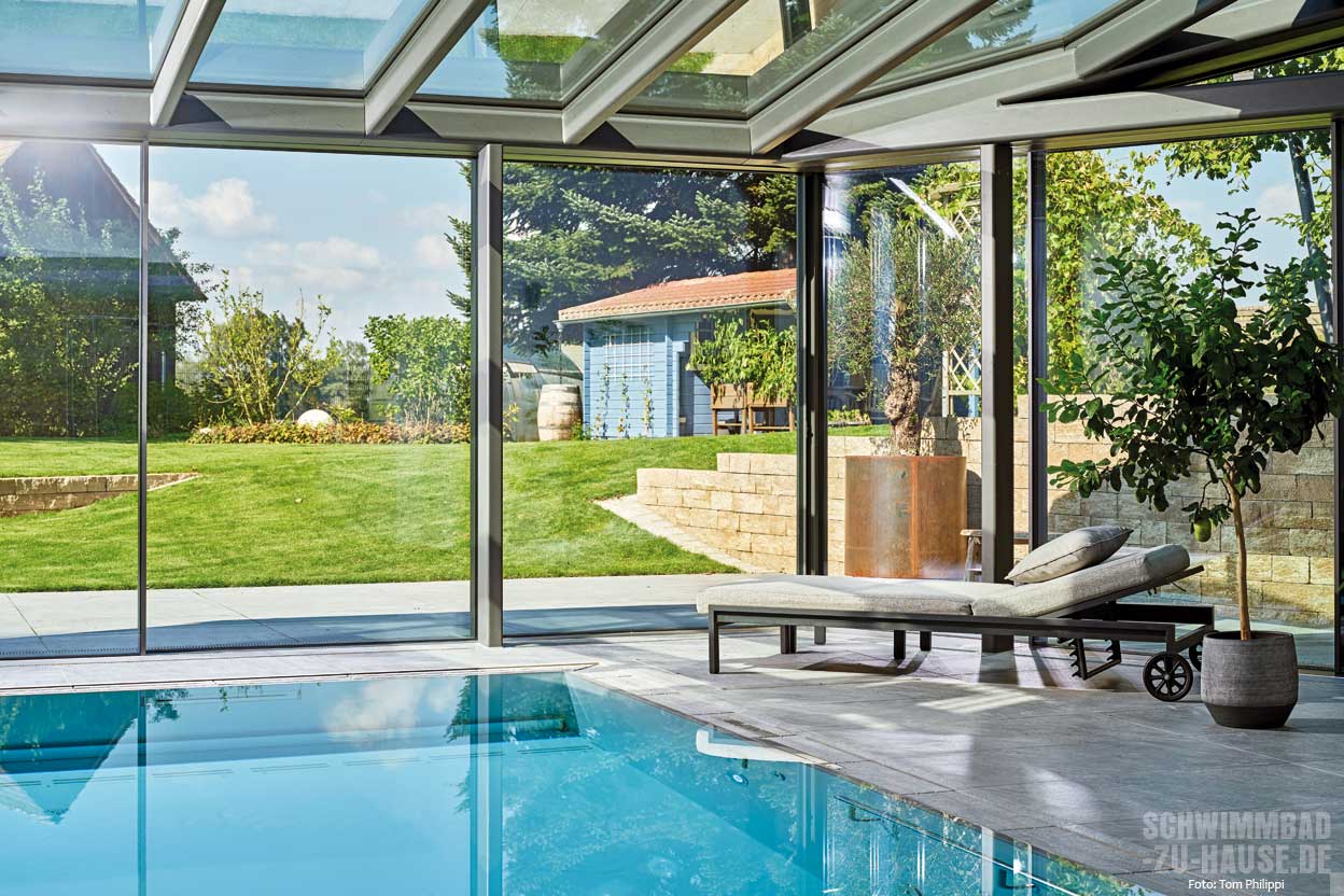 Gemeinsam wurden die Ideen weiterentwickelt und konkretisiert, sodass das Projekt nach und nach Gestalt annahm. Das frei auf den Füßen stehende Überlaufbecken aus Hart-PVC, für das man sich entschied, wurde in eine Art Wintergarten integriert. Dafür musste das Becken in einem Stück hinter das Haus und halb-souterrain zwischen das Fachwerk eingebracht werden – keine einfache Aufgabe, die jedoch mithilfe einer kleinen Traverse gelöst wurde. „Es war uns eine Freude, mit der sehr angenehmen Bauherrschaft dieses wunderschöne Projekt umzusetzen“, blickt Andreas Sorg zufrieden zurück.