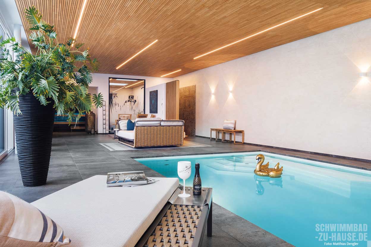 Durch eine wunderschöne Holzdecke, bequeme Liegen und Daybeds, Kaffeebar und Grünpflanzen wirkt die Schwimmhalle fast wie ein Wohnzimmer – inklusive Fernseher am Poolende, der es ermöglicht, beim Schwimmen die Lieblingsserie oder ein spannendes Sportereignis anzuschauen. Das Herzstück der gemütlichen Wohlfühloase ist aber der 10,20 x 3,50 Meter große Pool, der es der Familie erlaubt, das ganze Jahr über ihrer Leidenschaft fürs Schwimmen nachzugehen. Ideen für die Gestaltung holten sich die Bauherren in Zeitschriften und im Bekanntenkreis.