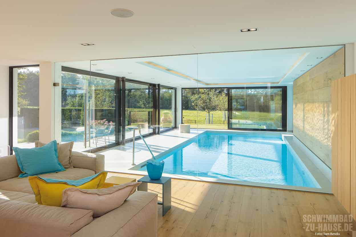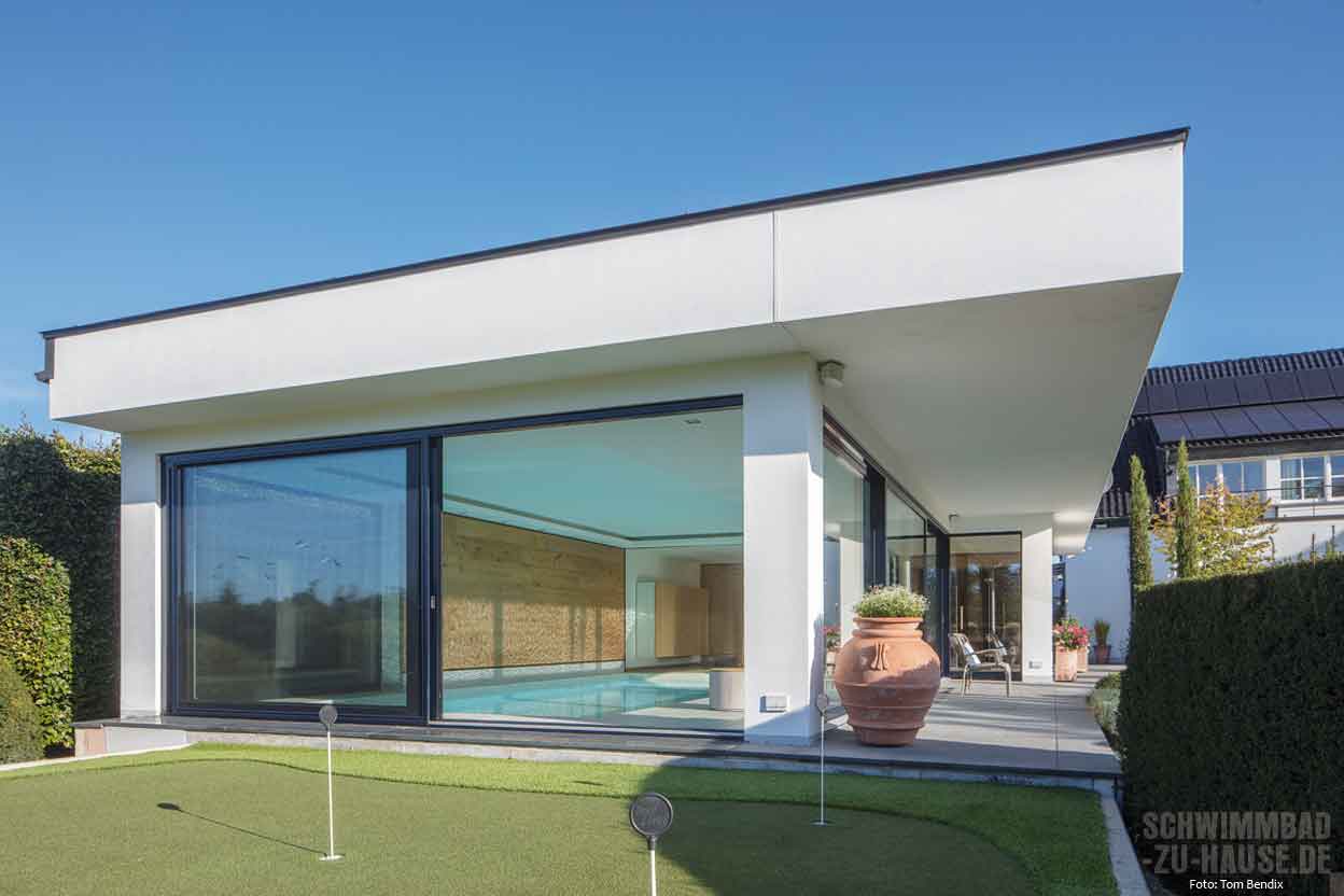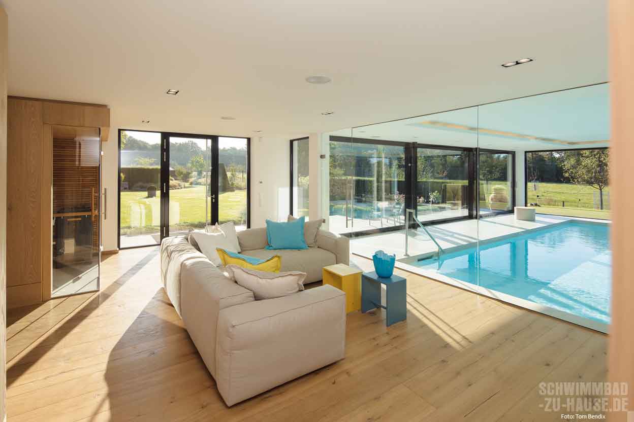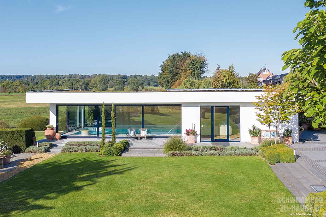 Schwimmen, Fitness, Saunieren und Entspannung, das sind die geheimen Zutaten für einen gesunden Lebensstil. Das wusste auch dieses Bauherrenpaar aus Bottrop und entschied sich für den Bau eines hochwertigen Poolhauses, das all diese Elemente in sich vereint. Gestalterisch präsentiert sich das private Spa reduziert, aber dennoch gemütlich-warm. Mittelpunkt ist ein hochwertiges Schwimmbecken mit Gegenstromanlage. Und nach dem Schwimmtraining geht es zur Entspannung ab in die Sauna. Eine wahre Win-win-Situation!