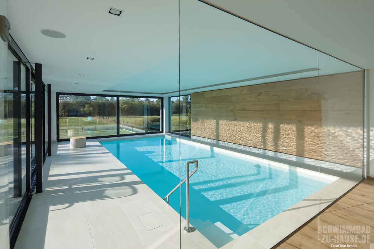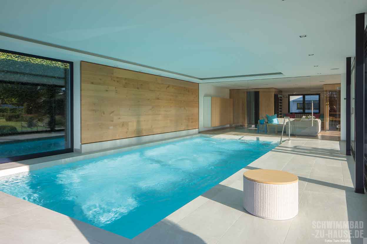 Auf die Frage nach den Gründen für die Anschaffung des Pools gab der Bauherr dieses modernen Poolhauses in Bottrop folgende Antwort: „Als ich noch deutlich jünger war, nutzte ich jede Möglichkeit, meine Vorliebe Schwimmen auszuleben. Heute, im fortgeschrittenen Alter, ist das tägliche Schwimmen schon fast ein absolutes Muss! Es hält meine Frau und mich fit und gesund. Hinzu kommt, dass wir alle anderen Extras wie Sauna und auch den Fitnessbereich jetzt täglich genießen.“ Ähnlich konkret waren auch die Vorstellungen hinsichtlich Gestaltung und Technik der heimischen Wohlfühloase. Klares Zentrum sollte ein geradliniges Schwimmbecken mit integrierter Gegenstromanlage für das ausgiebige Schwimmtraining werden. „Die Gestaltung der Schwimmhalle nimmt Bezug auf die Heimat meiner Frau – Südtirol“, verrät der Bauherr im weiteren Gespräch. „Wir lieben die schlichte und reduzierte Atmosphäre in Kombination mit wärmenden Holzelementen. Dies ruft eine wohltuende Behaglichkeit hervor. Ganz bewusst wollten wir auf modische Trends und unnötige Accessoires verzichten.“