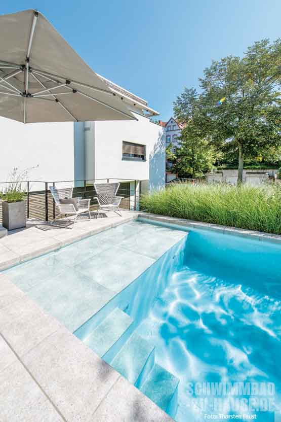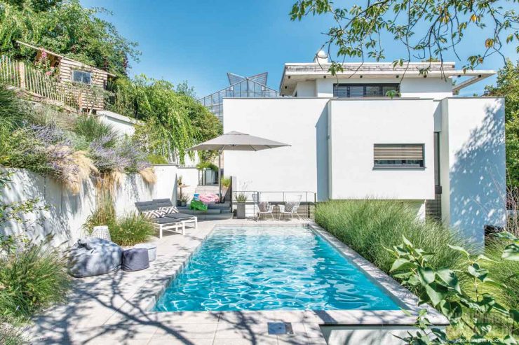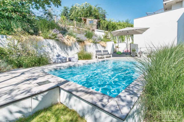 Jede private Wellnessoase hat eine individuelle Geschichte. Diese unterschiedlichen Geschichten sind es, die motivieren, inspirieren und Anstoß zu neuer Kreativität geben. So ist es auch bei der Familie Wienand aus Aschaffenburg. Urlaub zu Hause, Erfrischung an heißen Tagen und absolute Entspannung lauteten die Argumente, die für den eigenen Pool des berufstätigen Ehepaares sprachen. Ein Traumpool für die ganze Familie sollte es werden. „Da wir zunächst in der Planung unseres Einfamilienhauses kein Grundstück zur Bebauung mit einem Pool zur Verfügung hatten, war die Ursprungsidee, das Schwimmbad auf der Dachterrasse zu platzieren. Im Laufe des Hausbaus erhielten wir dann die Gelegenheit, das freie Nachbargrundstück zu erwerben“, erklärt Nadja Wienand die Positionierung des Betonbeckens. Jetzt bildet der Pool im Garten hinter dem Haus das klare Zentrum. In den Hang verbaut, schafft er die harmonische Verbindung zwischen Terrasse und Garten.