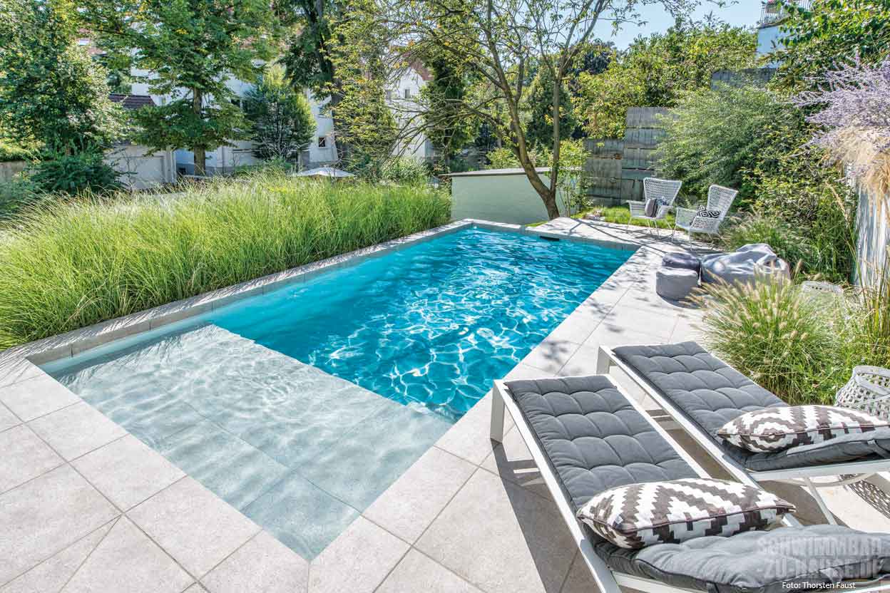 Genuss, Komfort und Design waren bei diesem Poolprojekt von Nadja und Mike Wienand aus Aschaffenburg oberste Prämisse. Das kompakte Becken im Zentrum des Gartens entspricht sowohl in der Formensprache als auch der technischen Ausstattung exakt ihren Vorstellungen. Highlight für die Eltern und die Kinder ist ohne Frage der mit Feinsteinzeug versehene Flachwasserbereich an der Stirnseite des Pools.