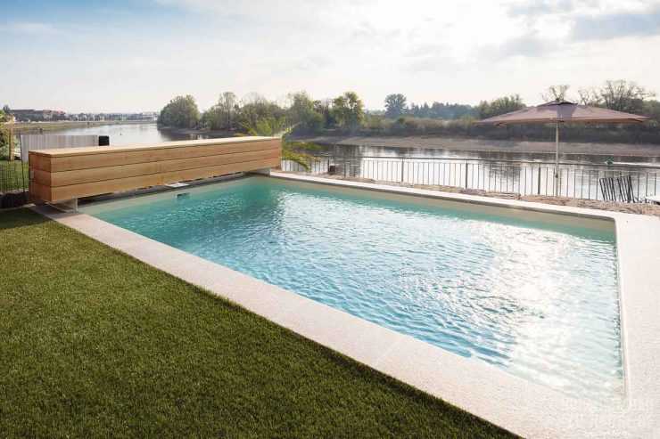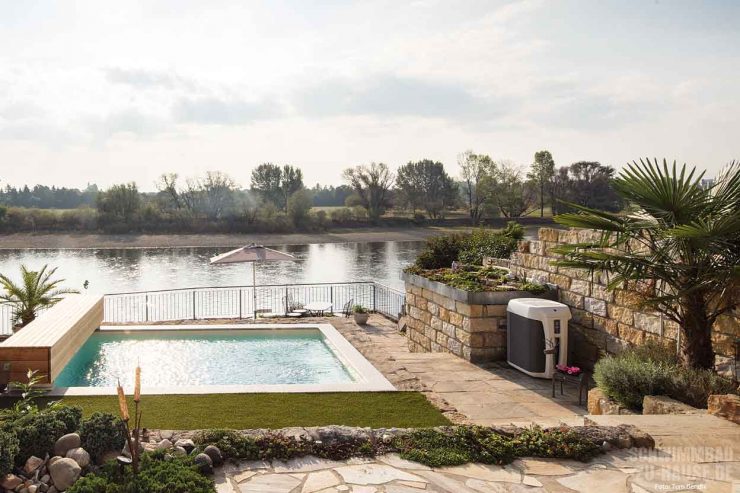 Für ihr Feriendomizil an der Elbe wünschten sich Kerstin und Andreas Scheibe einen kompakten Pool mit Gegenstrom- sowie Massageanlage, der die spektakuläre Lage im Garten in vollem Maße ausnutzt. Dabei sollte das Becken neben einer ästhetischen Optik auch mit nachhaltiger Schwimmbadtechnik ausgestattet sein – eine interessante Aufgabe für das Team von Schwimmbadbau Heide, die man ausgezeichnet meisterte.