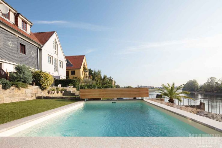 Die Sonne hat eine ungemein positive Wirkung auf den Menschen. Ihre warmen Strahlen hellen nicht nur die Stimmung auf, sondern stärken auch das Immunsystem. Während eines Sonnenbades produziert der Körper das für uns lebenswichtige Vitamin D. Die Laune steigt, wir entspannen und fühlen uns fit. Kein Wunder also, dass es beinahe alle Menschen in den warmen Monaten des Jahres nach draußen in die Sonne zieht. Auch Kerstin und Andreas Scheibe sind große Sonnenliebhaber. Besonders im Urlaub genießt das berufstätige Paar die freie Zeit zum ausgiebigen und entspannten Sonnenbaden im Garten ihres Ferienhauses in Dresden. Dieses liegt, in spektakulärer Lage mit Blick auf die Stadt, direkt an der Elbe. „Unser Haus in der Schweiz verfügt über einen privaten Pool, den wir regelmäßig nutzen. Daher wünschten wir uns auch für das Ferienhaus in Dresden ein Schwimmbecken“, erklärt das Ehepaar Scheibe im exklusiven Gespräch mit haus+wellness*. Das neue Badeparadies, für das der Platz im Garten hinter dem Haus recht begrenzt war, sollte Sport und Entspannung vereinen und sich hierbei harmonisch in die Umgebung einfügen.