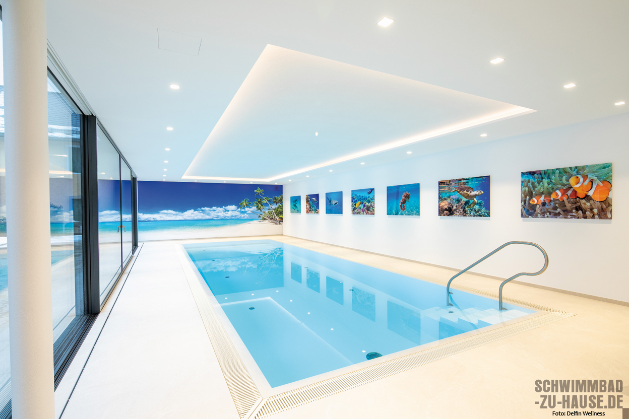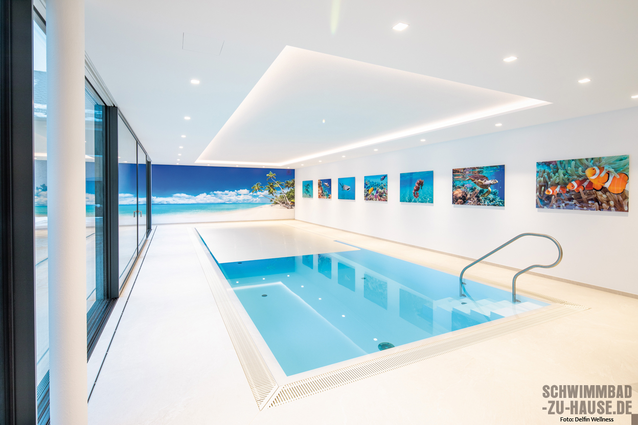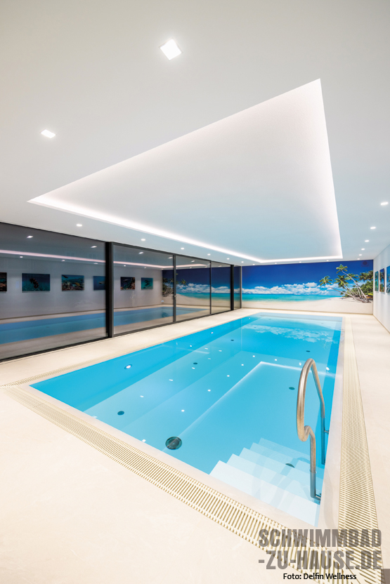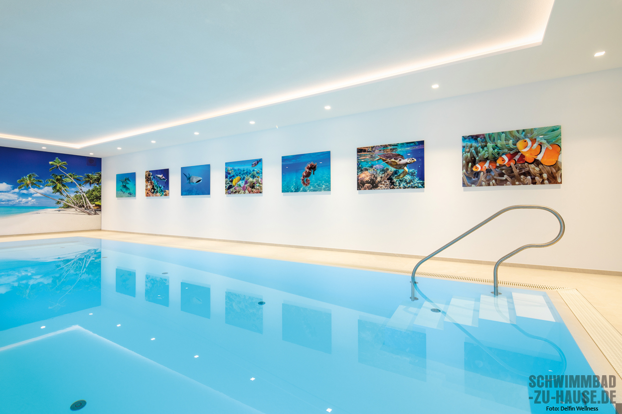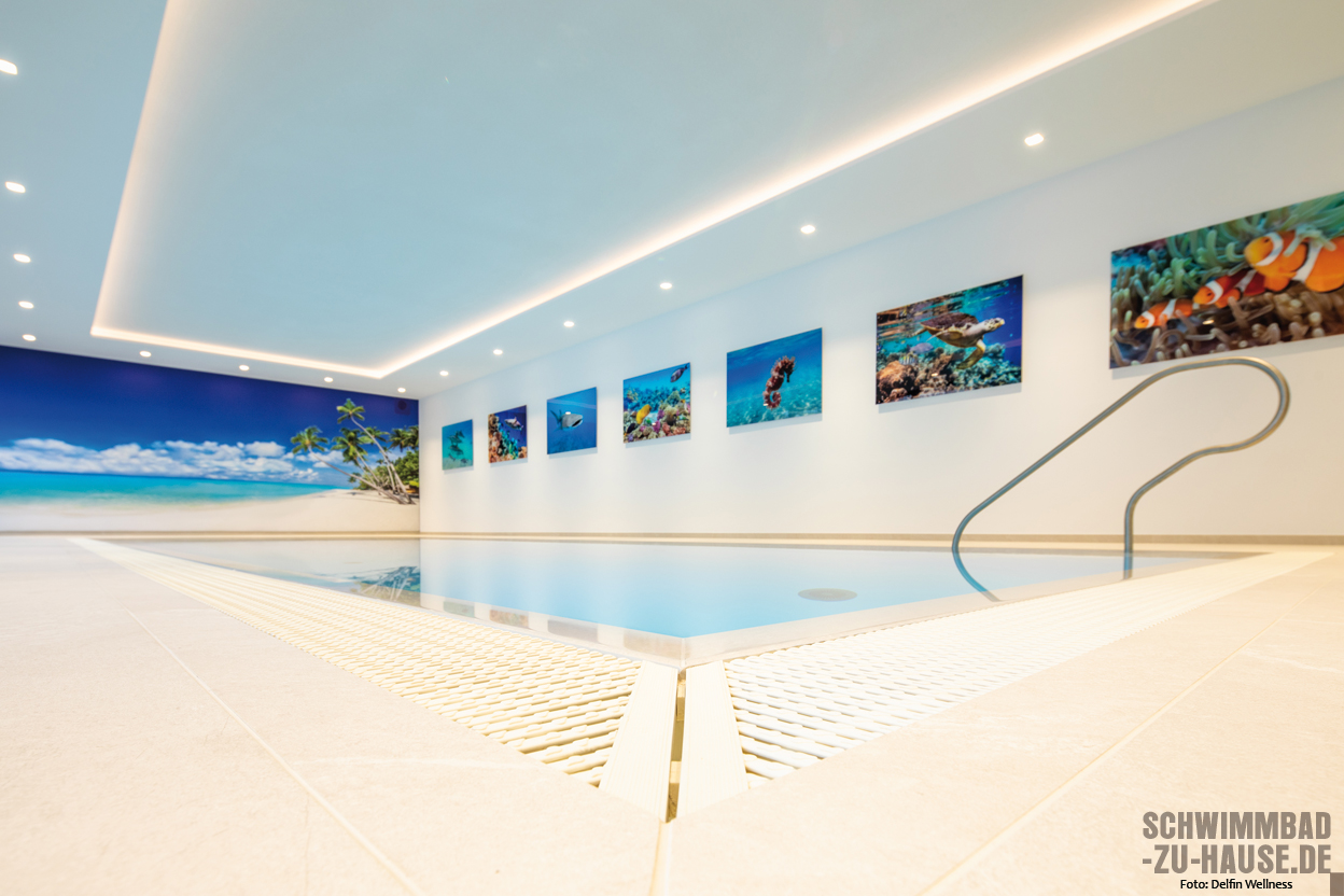 Bei der Karibik denken wir unwillkürlich an helle, feinpudrige Strände und türkisblaues Meer. Und genau das hat der Schwimmer vor Augen, wenn er auf die bedruckte Fotowand am Ende des Pools zusteuert. Der helle Bodenbelag scheint mit dem Sandstrand zu verschmelzen und macht die Illusion perfekt, während die seitliche Bildergalerie wunderschöne Einblicke in faszinierende Unterwasserwelten gewährt.
