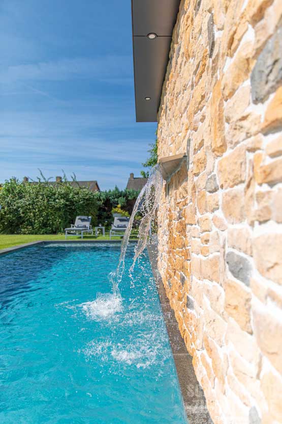 Die Wahl fiel auf einen umweltfreundlichen und qualitativ hochwertigen Skimmer Invisible Pool, der mit seinem exklusiven Design und seiner Alltagstauglichkeit punktet. Die großzügigen Abmessungen von 9,0 x 3,6 x 1,4 Meter garantieren der Familie unbeschwerten Badespaß. Ein ausgefallener Hingucker ist der kleine, seitlich am Gartenhaus angebrachte Wasserfeature. Doch das Schönste an diesem gelungenen Projekt ist die pure Freude und die kostbaren Momente, die die Familie bei jedem Besuch der Großeltern und dem ungetrübten Badespaß der Urenkel erleben darf.