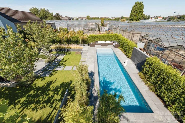 Nun fehlte nur noch das richtige Profiteam, um die genannten Wünsche für Garten und Schwimmbad fachgerecht in die Tat umzusetzen. Mit der Wahl des Architekten Peter Berg entschieden sich die Bauherren für einen international bekannten Gartenexperten. Den Schwimmbadbauer Frank Deuss von der Firma 3D-Pools wiederum lernten sie auf eine Empfehlung eines Freundes kennen. Nachdem sich Bauherren, Architekt und Poolbauer über die Positionierung des Beckens ausgetauscht hatten, stand relativ schnell fest: Das neue Badeparadies sollte sich längs des seitlichen Rands des Gartens, direkt die hohe Hecke entlang, die vor unerwünschten Blicken schützt, erstrecken.