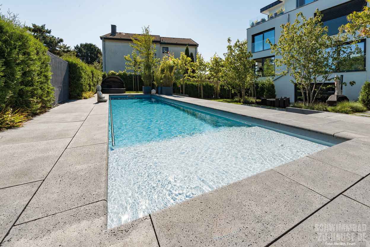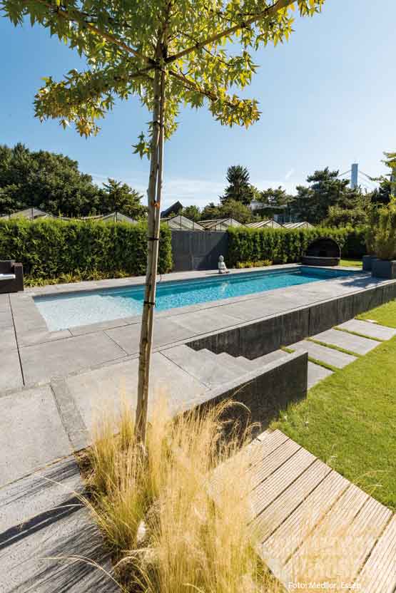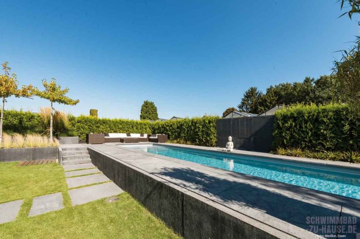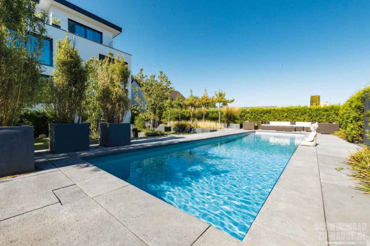 Relaxen zu Hause. Dies war die Devise bei der Planung und Umsetzung des geradlinigen Beckens der Bauherren aus Düsseldorf. Hierbei sollte das Gesamtbild des Gartens verbessert und zugleich der Platz zum Spielen für den Nachwuchs beibehalten werden. Das Ergebnis, ein moderner Pool, der mit Betonsteinen umrandet ist, übertrifft die Erwartungen der Familie.