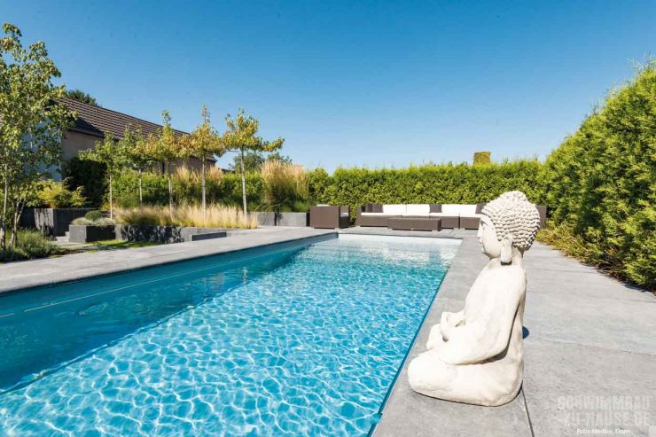 Die japanische Lehre des Zen besagt unter anderem, dass man das Leben in seiner ganzen Fülle leben soll. Um dies zu erreichen, bedarf es innerer Ruhe und der Balance zwischen Körper und Geist. Das ist in der heutigen Zeit oftmals schwer. Der stressige Arbeitsalltag und die Schnelllebigkeit der Gegenwart machen rastlos und zehren an den Kräften. Urlaub, Entspannung und Wellness stellen daher für viele Menschen die ideale Lösung – und den perfekten Ausgleich – dar. Die Bauherren dieses Projekts in direkter Rheinnähe in Düsseldorf wollten Urlaub und Zuhause miteinander verbinden. Daher hieß es jüngst: Der eigene, ganz private Outdoor-Pool hinter dem Haus muss her! Denn in der Schwerelosigkeit des Wassers kann man rundum ausspannen und den Alltag hinter sich lassen.