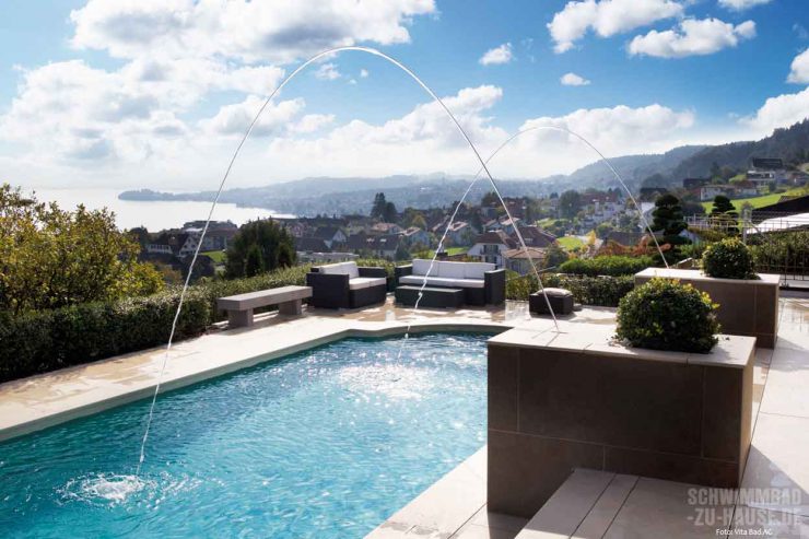 Möglich ist dies durch eine in die Beckenwand integrierte Gegenstromanlage. Sie ermöglicht durch ihren kraftvollen Strom das Schwimmen auf einem relativ kleinen Raum. „Die Bauherren legten neben einer ansprechenden Optik großen Wert auf hochwertige Technik“, verrät Ueli Achermann von Vita Bad im exklusiven Interview mit haus+wellness*. „Sowohl was die natürliche und chlorfreie Wasseraufbereitung betrifft, als auch hinsichtlich individueller Extras wie Unterwasserbeleuchtung und Wasserspiele hatte man konkrete Vorstellungen“, so der Fachmann weiter.