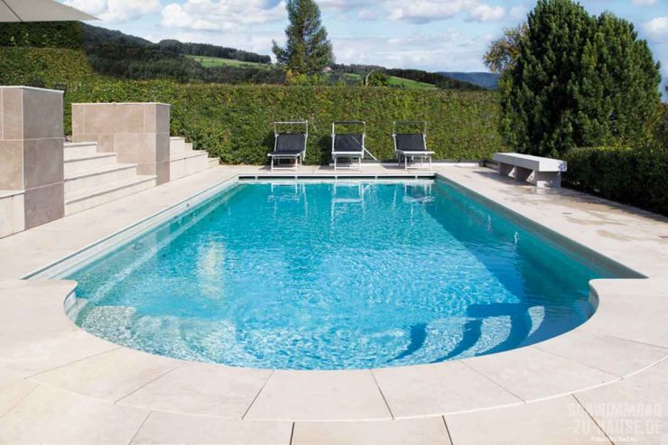 Mein Stil, mein Pool – so lautet das Motto, das diesem beeindruckenden Pool-Projekt zugrunde liegt. Jedes Detail des privaten Badeparadieses wurde sorgfältig ausgesucht: vom Becken, über die Poolfeatures und die Schwimmbadtechnik bis hin zu Positionierung, Beckenumrandung und Farbgestaltung. Herzstück und wichtigstes Element eines jeden Projekts ist das Becken. Die Wahl fiel hier auf das Carbon Ceramic Becken „XL Java 114“ in der Farbe Nova Pearl, das sich mit den Maßen 11,40 x 3,96 Meter ideal in die für den Pool vorgesehene Stelle im Garten einfügt. Zu Füßen gelegt: Das rechteckige Einstückbecken mit rundem Einstieg im klassischen römischen Stil verläuft parallel zum etwas höher liegenden Wohnhaus der Familie und ist über einige wenige Treppen von der Terrasse des Gebäudes aus bequem zu erreichen. Dank der hellbeigen Beckenfarbe schimmert das Wasser in einem hellen Blau, das an das tropische Meer der Karibik erinnert. Um den Einstieg über die römische Treppe hinein ins kühle Nass so komfortabel wie möglich zu gestalten, fällt der Boden des Beckens graduell von 1,10 auf 1,68 Meter ab. Nach Lust und Laune kann man sich also entweder im flachen Wasser sonnen oder im tieferen Wasser an der Stirnseite des Beckens sportlich ein Schwimmtraining absolvieren.
