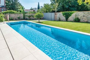 Einen Pool, in dem man richtig ausgiebig schwimmen kann, das wünschten sich die Eheleute aus Unterfranken schon lange. „Daher sollte das Becken bestimmte Maße haben: lang und gar nicht so breit“, erläutern sie, deshalb haben sie sich für ein Folienbecken mit den Abmessungen 13,00 x 2,79 x 1,55 Meter entschieden haben, das jetzt parallel zum Haus verläuft. Ein weiterer Vorteil: Egal, wo man auf der Terrasse sitzt, man befindet sich immer am Wasser und genießt dieses ganz besondere Urlaubsfeeling. Der Betonbeckenkörper wurde übrigens mit der Schwimmbadfolie „Alkorplan 2000“ in Hellgrau ausgekleidet, die sich ideal für größere Becken eignet und ihnen eine elegante Optik und zeitlose Schönheit verleiht.