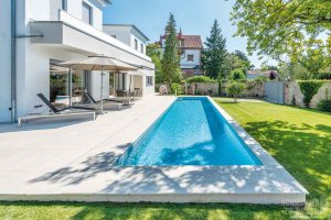 „Die üblichen Standard-Maße wie 8 x 4 Meter werden immer weniger nachgefragt“, bestätigt Thorsten Staab, der mit der Planung uns Umsetzung dieses Projekts beauftragte Schwimmbadbauer von der Firma Pool-Konzept aus Haibach. Ein Besuch in der dortigen Ausstellung brachte Hausbesitzer und Schwimmbadbauer zusammen. „Dabei haben es uns die Bauherren recht einfach gemacht, da sie sehr konkrete Vorstellungen hatten. Optisch ist das schmale Becken im Vordergrund des Hauses natürlich ein absoluter Hingucker.“
