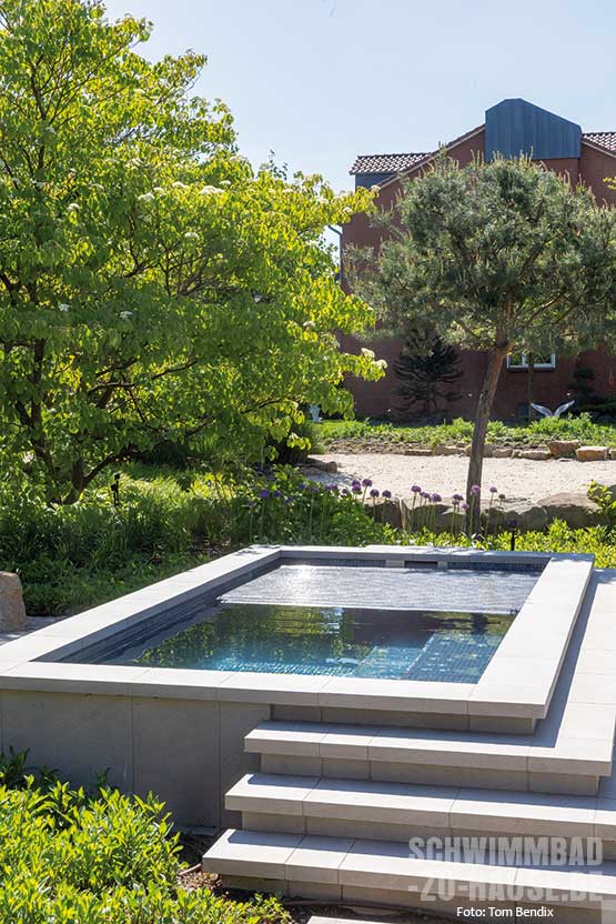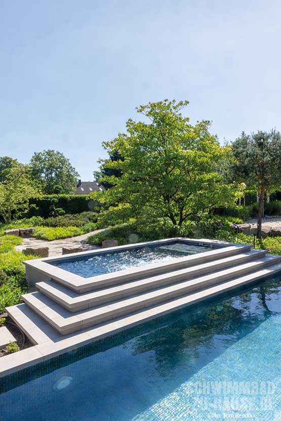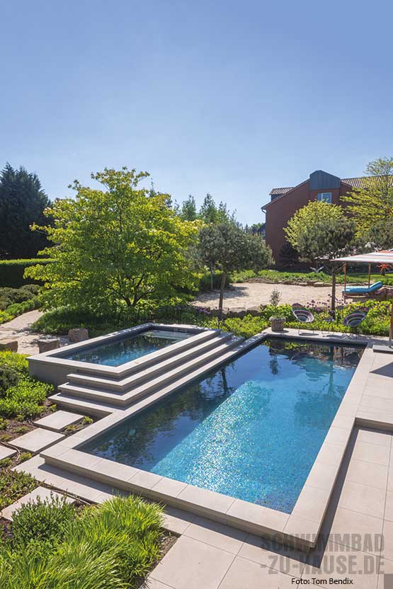 Diese Vision entfaltet sich in einer konsequent durchdachten Gestaltung. Großformatige Natursteinplatten fassen die Wasserflächen ein und verleihen dem Ensemble Struktur. Flache Stufen führen sanft in die Becken und verbinden beide Elemente harmonisch.