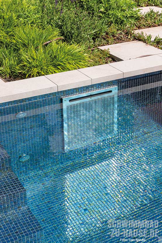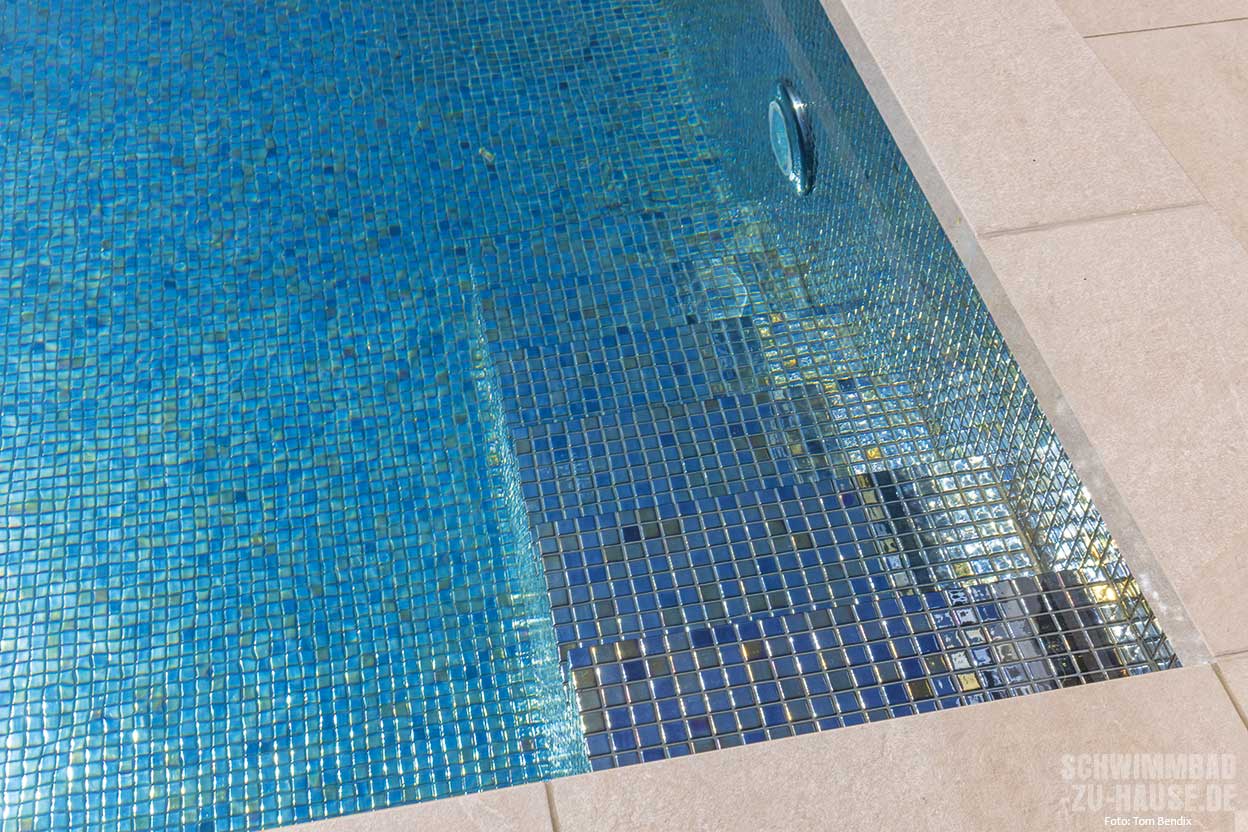 Beide Becken sind mit hochwertigen Ezarri-Mosaikfliesen ausgekleidet. Ihr changierendes Farbspiel verleiht der Wasseroberfläche je nach Lichtstimmung eine beinahe mediterrane Tiefe. Eine integrierte Rollladenabdeckung von Riviera Pool sorgt dafür, dass die Wassertemperatur konstant bleibt. Gleichzeitig reduziert sie den Energieverbrauch und schützt die Becken zuverlässig.